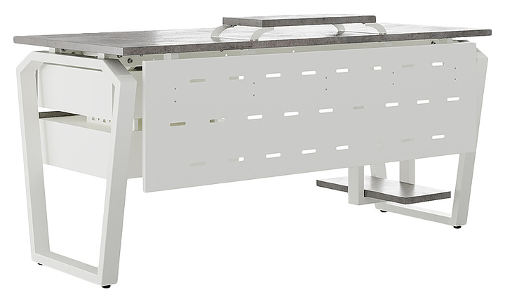 Офисный стол Кобор TB-80/60 white/chicago используется в офисных помещениях и кабинетах руководителей. Модель оснащена опорами в форме обратной трапеции со скошенными верхними углами. Каркас выполнен из металла, выкрашенного в цвет белый муар (RAL9016), столешница – из ламинированной древесно-стружечной плиты (ЛДСП) цвета бетон чикаго (F186 ST9). Опции (заказываются отдельно):