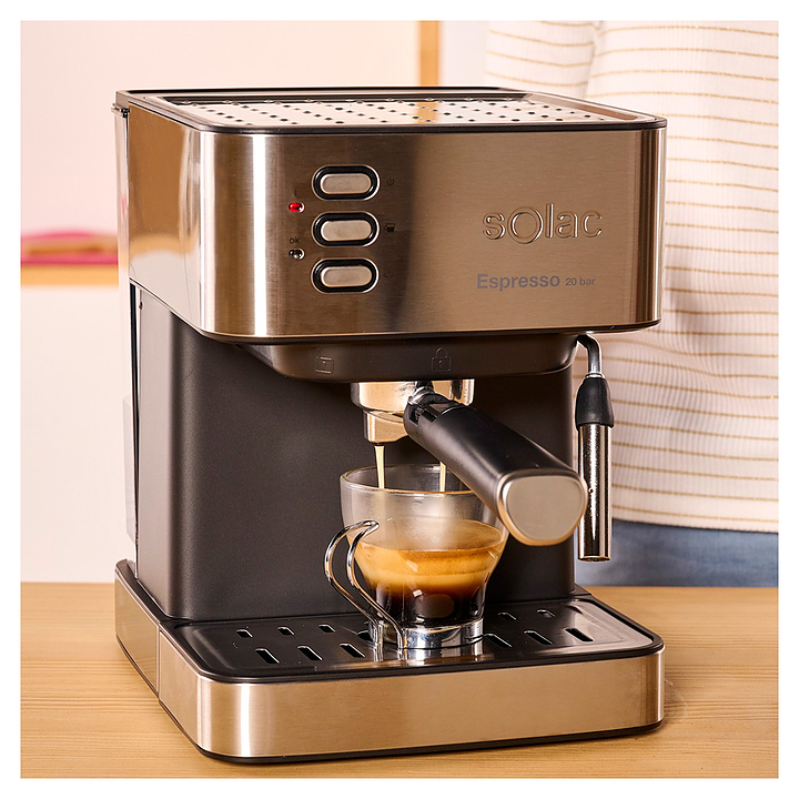 Кофеварка Solac Solac Espresso CE4481 предназначена для приготовления эспрессо в отелях, офисах, частных домах и квартирах. Модель оснащена водяной помпой, съемным резервуаром для воды с откидной крышкой, кабелем питания с вилкой, фронтальной электромеханической панелью управления с поворотным регулятором подачи пара, 3 функциональными кнопками и светодидными индикаторами. Корпус выполнен из металла и пластика с черной матовой поверхностью, фронтальные панели, платформа для чашек, корпус портафильтра, решетка поддона и трубка – из нержавеющей стали. В комплект поставки входят портафильтр, темпер с мерной ложкой, фильтры на 1 и 2 чашки. Особенности: