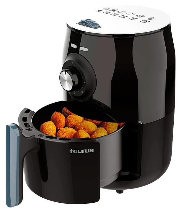 Аэрофритюрница Taurus Respire Analogic предназначена для приготовления различных пищевых продуктов без использования масла в отелях, офисах, а также домашних условиях. Модель оснащена съемным выдвижным контейнером с вертикальной рукояткой и простым электромеханическим управлением. Корпус обтекаемой формы выполнен из пластика черного цвета с глянцевой поверхностью. Особенности: