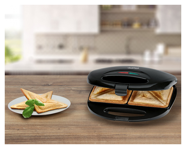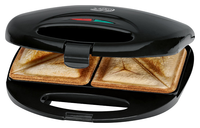 Сэндвичница Clatronic ST 3477 black1 используется в отелях, офисах, а также домашних условиях для приготовления сэндвичей. Модель оснащена жарочными поверхностями с 4 сегментами треугольной формы, кабелем питания с вилкой и контрольными индикаторами на верхней створке. Корпус выполнен из прочного пластика черного цвета с глянцевой поверхностью, жарочные поверхности – из металла с антипригарным покрытием. Особенности: