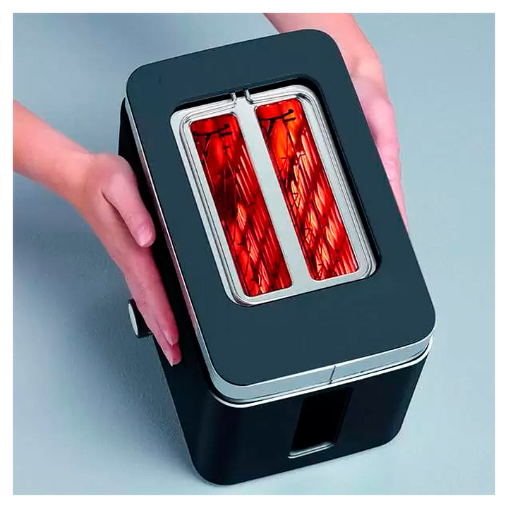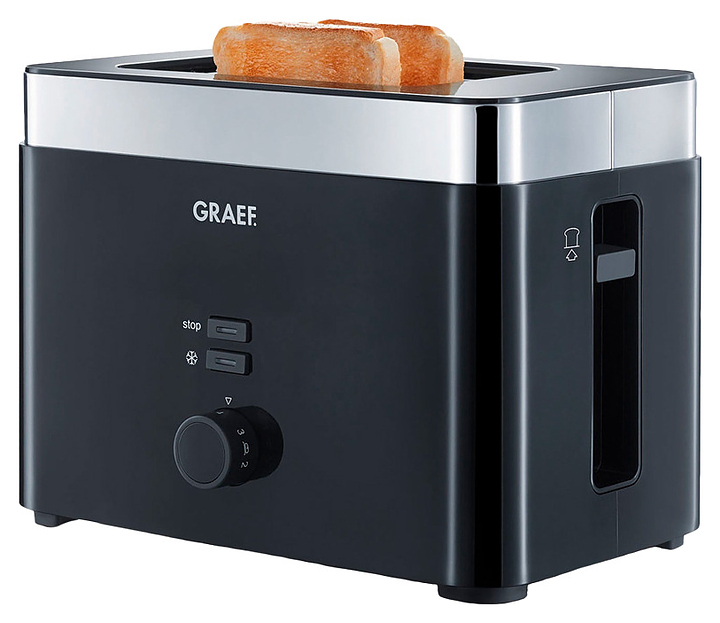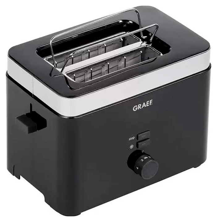 Тостер Graef TO 62 используется в отелях, офисах, а также домашних условиях для обжаривания ломтиков хлеба различных сортов. Модель оснащена 2 отсеками для тостов, кабелем питания с вилкой, электромеханической панелью управления с поворотным переключателем, функциональными кнопками и светодиодными лампами индикации. Корпус прибора прямоугольного сечения выполнен из пластика черного цвета, верхняя окантовка, решетка и корпус поддона – из металла с серебристой поверхностью. Особенности: