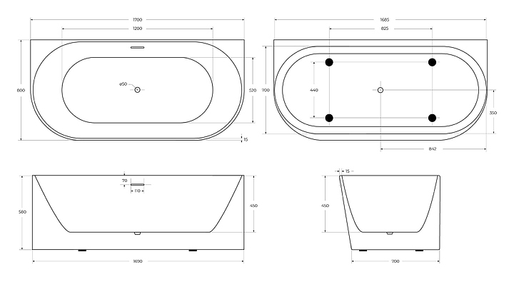 Ванна BelBagno BB412-1700-800-MATT дополнит интерьер ванной комнаты. Расположенный по центру слив не будет мешать купанию. Изделие выполнено из литьевого акрила, который отличается гигиеничностью в использовании, устойчивостью к ультрафиолету, истиранию и плесени, высокой температуре, сохраняет блеск и насыщенный стойкий цвет. В комплект поставки входят слив-перелив и крепления. Особенности: