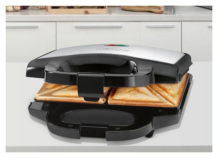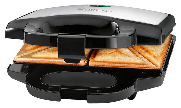 Сэндвичница Clatronic ST 3478 используется в отелях, офисах, а также домашних условиях для приготовления сэндвичей. Модель оснащена жарожными поверхностями с 4 сегментами треугольной формы, кабелем питания с вилкой и контрольными индикаторами на верхней створке. Корпус выполнен из прочного пластика черного цвета с вставкой из нержавеющей стали на крышке, жарочные поверхности – из металла с антипригарным покрытием. Особенности: