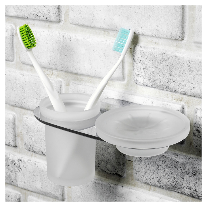 Двойной держатель Wasserkraft Kammel K-8326 предназначен для размещения зубных щеток и мыльницы в ванной комнате. Аксессуары коллекции Kammel идеально дополнят дизайн любой ванной комнаты. Модель оснащена держателем, стаканом для зубных щеток и мыльницей, имеет скрытые крепления и монтируется на стену. Изделие выполнено из металла и матового стекла. В комплект поставки входят стакан, держатель, мыльница и уплотнительные пластиковые кольца. Особенности: