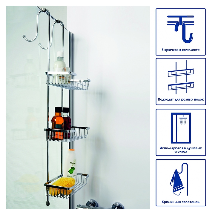 Держатель Wasserkraft K-1133 используется в душевых уголках для размещения подвесных полок. Аксессуры серии идеально дополнят интерьер любой ванной комнаты. Модель оснащена 5 крючками, на которых удобно повесить полотенца или банные халаты. Изделие выполнено из металла. Особенности: