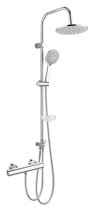 Душевая система ORANGE Agger Thermo A2492200 предназначена для использования в ванных помещениях для подачи горячей и холодной воды. Модель оснащена круглым верхним тропическим душем с силиконовыми наконечниками для простого удаления известкового налёта, стойкой, регулируемым держателем для ручного душа, мыльницей, круглой ручной лейкой с системой защиты от известковых отложений и душевым шлангом с защитой от перекручивания. Термостатический картридж обеспечивает поддержание необходимой температуры в независимости от давления воды. Изделие выполнено из латуни, отличающейся прочностью, долговечностью и устойчивостью к перепадам температур, и ABS-пластика. Особенности: