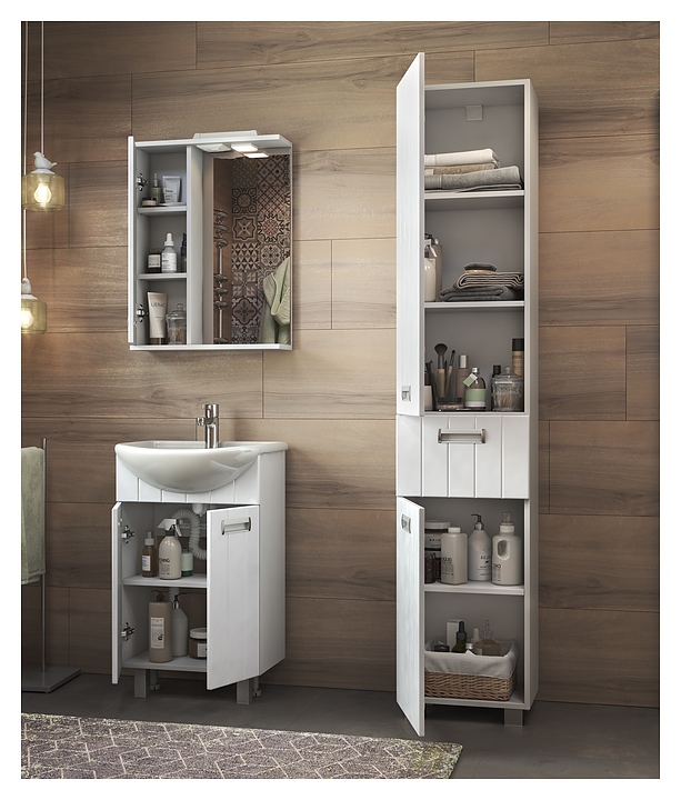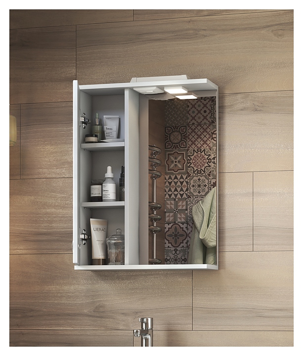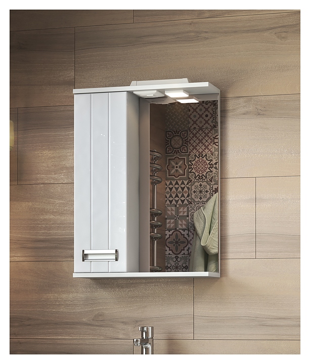 Левостороннее зеркало VIGO Diana 500 от российского бренда дополнит интерьер ванной комнаты. Благодаря подвесной конструкции модель не занимает много места, что экономит пространство и облегчает уборку. Изделие оснащено LED-светильником, включателем с розеткой, шкафчиком с распашной дверцей и доводчиком для плавного закрывания, 2 полками внутри и одной снаружи в нижней части. Корпус и полки выполнены из матовой ЛДСП, фасад - из ЛМДФ в глянцевой пленке ПВХ, ручка - из металла. Дополнительные характеристики:
