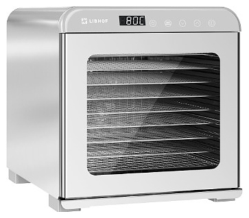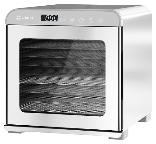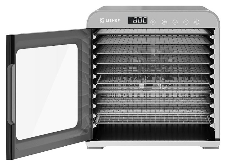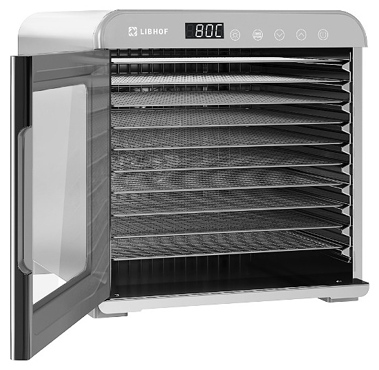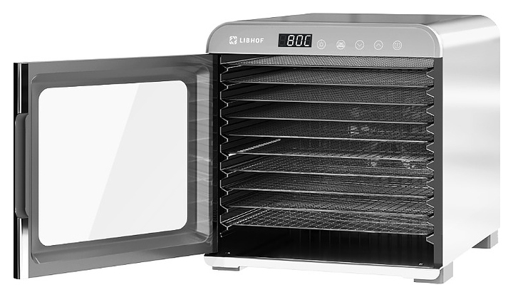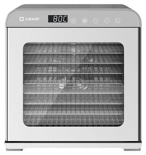 Дегидратор Libhof FDG-10 используется для сушки овощей, фруктов, ягод, грибов и трав, а также вяления рыбы, расстойки теста, приготовления сухариков, пастилы и йогурта в домашних условиях. Модель оснащена камерой с 10 уровнями направляющих для размещения поддонов, расположенными в задней стенке вентилятором и нагревательными элементами, распашной дверью, кабелем питания, расположенными в верхней части фронта сенсорной панелью управления и светодиодным цифровым дисплеем. Корпус и поддоны выполнены из высококачественной нержавеющей стали, дверь с полным наружным остеклением без винтового крепежа. В комплект поставки входят 10 съемных решетчатых поддонов, мелкоячеистая сетка, 6 лотков для пастилы и инструкция по эксплуатации. Особенности: