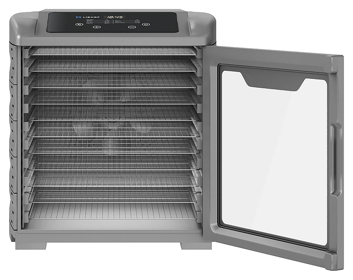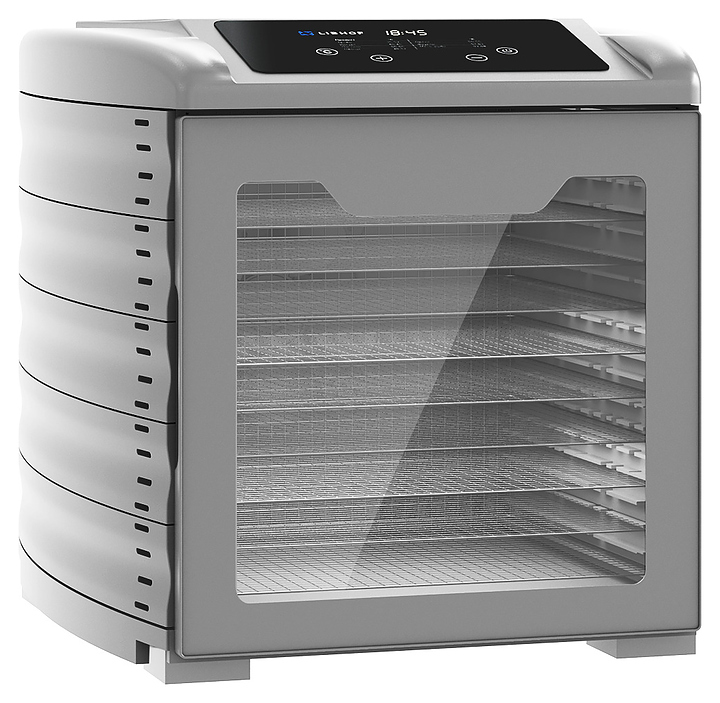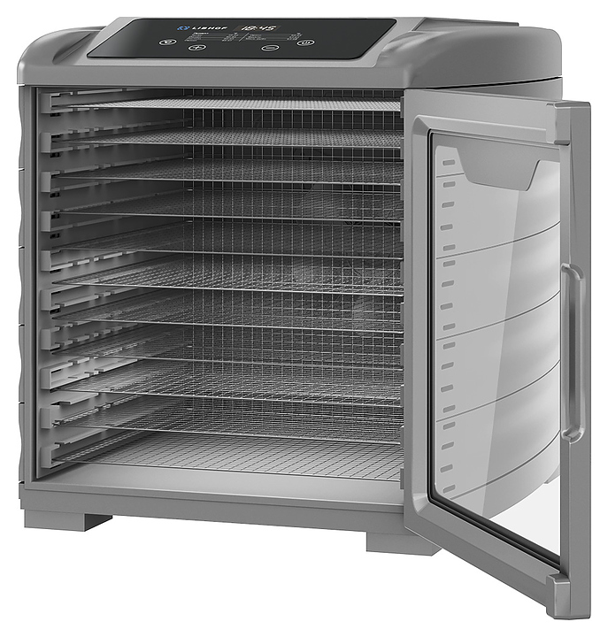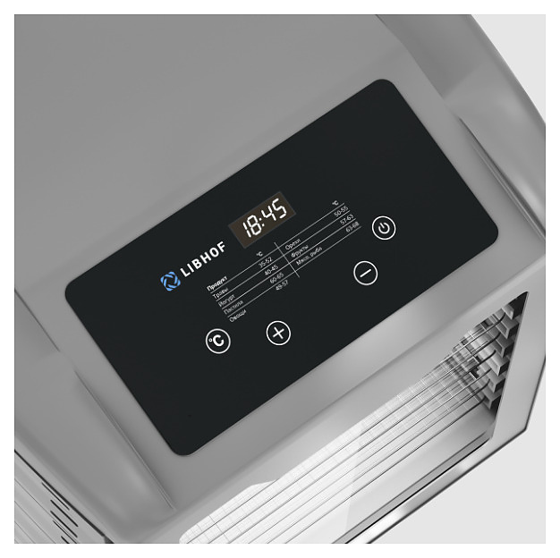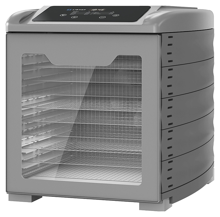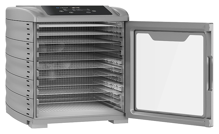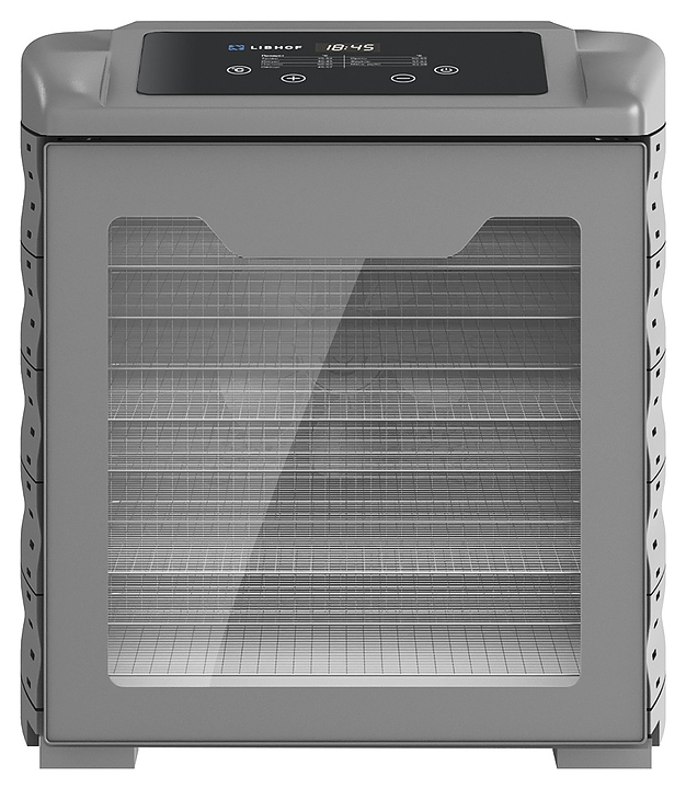 Дегидратор Libhof FDL-10 используется для сушки овощей, фруктов, ягод, грибов и трав, а также вяления рыбы, расстойки теста, приготовления сухариков, пастилы и йогурта в домашних условиях. Модель оснащена камерой с 10 уровнями направляющих для размещения поддонов, расположенными в задней стенке вентилятором и нагревательными элементами, распашной дверью, кабелем питания, расположенным на верхней наклонной панели блоком управления с сенсорной клавиатурой и светодиодным цифровым дисплеем. Корпус выполнен из пластика, поддоны – из высококачественной нержавеющей стали, дверь с полным наружным остеклением без винтового крепежа. В комплект поставки входят 10 решетчатых поддонов, мелкоячеистая сетка, 6 лотков для пастилы и инструкция по эксплуатации. Особенности: