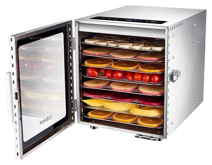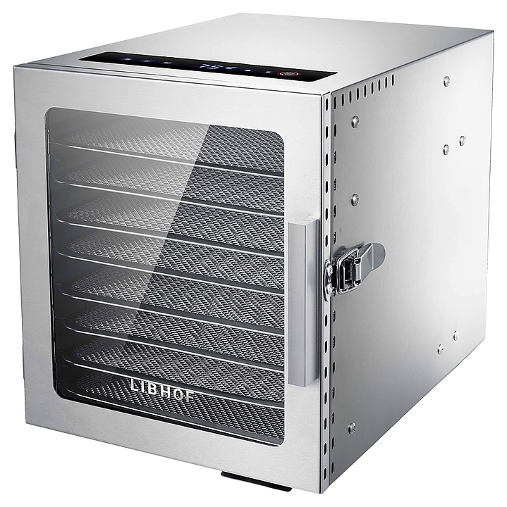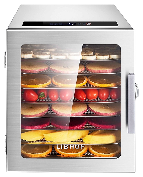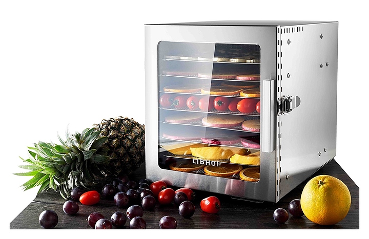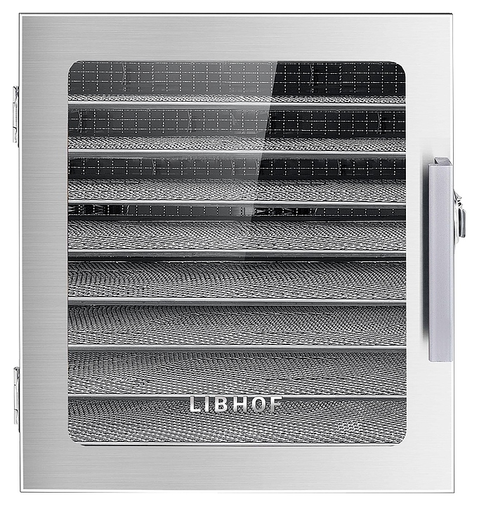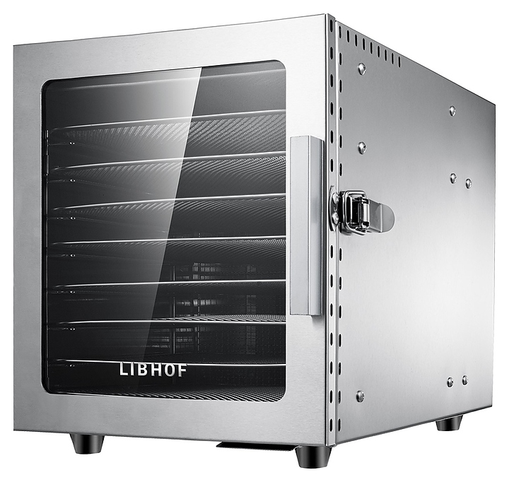 Дегидратор Libhof FDP-08 используется для сушки овощей, фруктов, ягод, грибов и трав, а также вяления рыбы, расстойки теста, приготовления сухариков, пастилы и йогурта в домашних условиях. Модель оснащена камерой с 8 уровнями направляющих для размещения поддонов, расположенными в задней стенке вентилятором и нагревательными элементами, распашной дверью с вертикальной рукояткой, кабелем питания, расположенным на верхней панели блоком управления с сенсорной клавиатурой и светодиодным цифровым дисплеем. Корпус и поддоны выполнены из высококачественной нержавеющей стали. В комплект поставки входят 8 съемных решетчатых поддонов, мелкоячеистая сетка, 4 лотка для пастилы и инструкция по эксплуатации. Особенности: