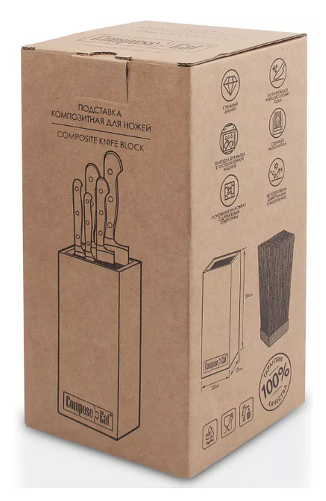 Подставка ComposeEat PDN120654KL6 предназначена для хранения кухонных ножей и ножниц на предприятиях общественного питания и торговли, в частных домах и квартирах. Модель оснащена ножками и дренажным отверстием. Корпус выполнен из бумажного композитного материала, наполнитель - из пластика. Особенности:
