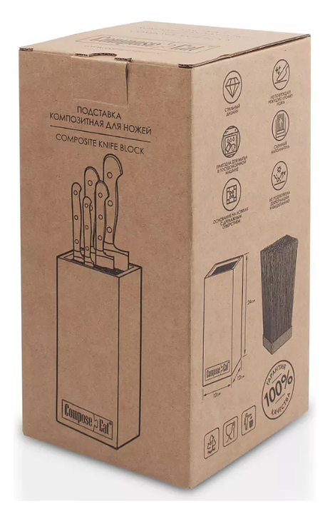 Подставка ComposeEat PDN120433KL6 предназначена для хранения кухонных ножей и ножниц на предприятиях общественного питания и торговли, в частных домах и квартирах. Модель оснащена ножками и дренажным отверстием. Корпус выполнен из бумажного композитного материала, наполнитель - из пластика. Особенности: