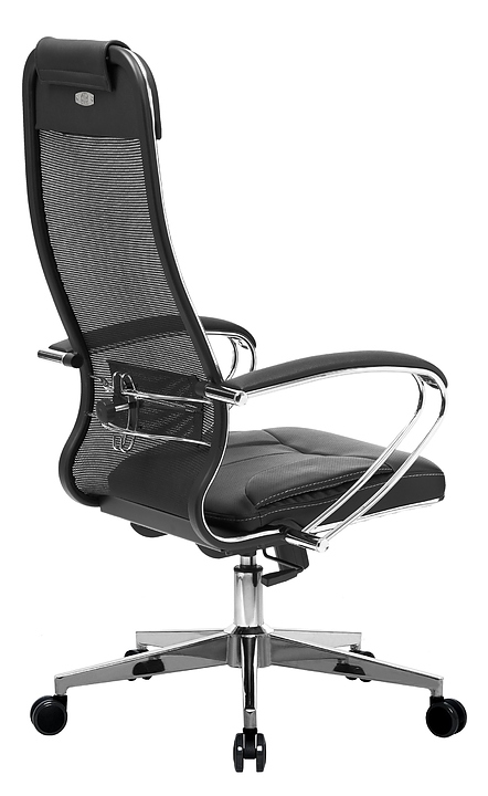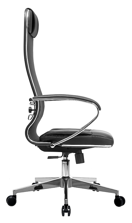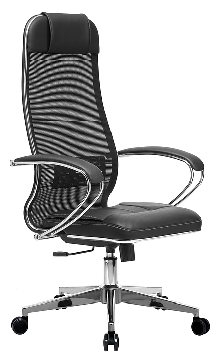 Кресло Метта Комплект 5 (MPES)/подл.116/осн.004 предназначено для долгой работы за компьютером на даче, дома, а также в офисах. Модель оснащена высокой замкнутой сверху спинкой с мягким накладным подголовником и мягким комфортным сиденьем. Обивка подголовника, сиденья и подлокотников выполнена из экокожи, обивка спинки - из натяжной сетки, каркас подлокотников и пятилучье с прямоугольным сечением - из хромированной стали. Особенности: