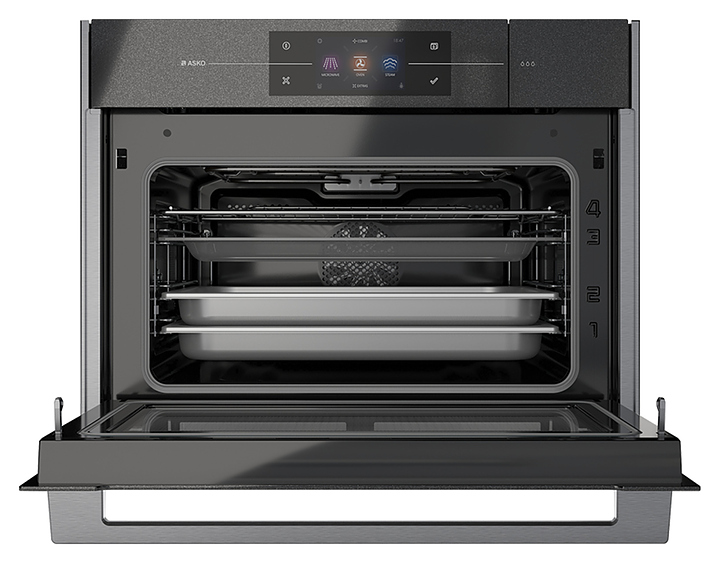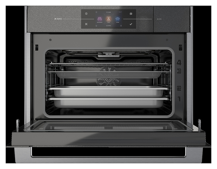 Электрический духовой шкаф ASKO OCSM8478Gпредназначен для приготовления большого ассортимента блюд в домашних условиях. Модель оснащена вместительной камерой с вентилятором в задней стенке, магнетроном в нижней части, верхним и нижним нагревателями, верхним грилем, 2 съемными боковыми стойками с направляющими для противней, откидной дверью с прямоугольным смотровым окном и горизонтальной рукояткой, отсеком со съемным резервуаром для воды, 4 фиксированными опорами, панелью управления с информативным полноцветным сенсорным TFT дисплеем с символьными, графическими и цифровыми сегментами индикации. Корпус выполнен из металла с покрытием фронта черного цвета, остекление двери – из стеклокерамики.