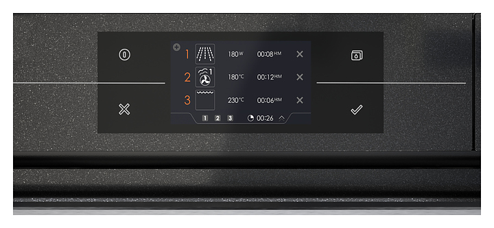 Цифровая индикация температуры, мощности микроволн, даты и электронных часов, времени начала и окончания, прямого или обратного отсчета заданной длительности приготовления