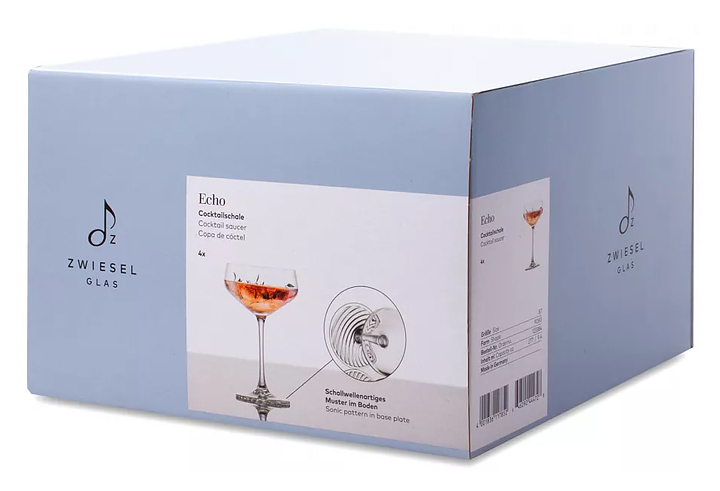 Набор из 4 бокалов для шампанского и коктейля Zwiesel Glas Echo 123384 выполнен из прочного, прозрачного хрустального стекла. Знаком отличия продукции является мелодичный звон, издаваемый бокалами и стаканами во время тоста. Особенности:
