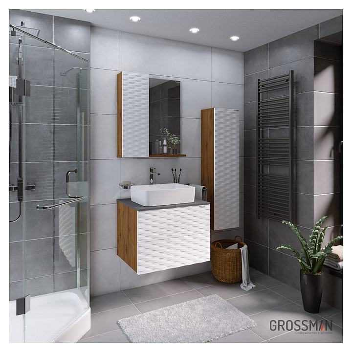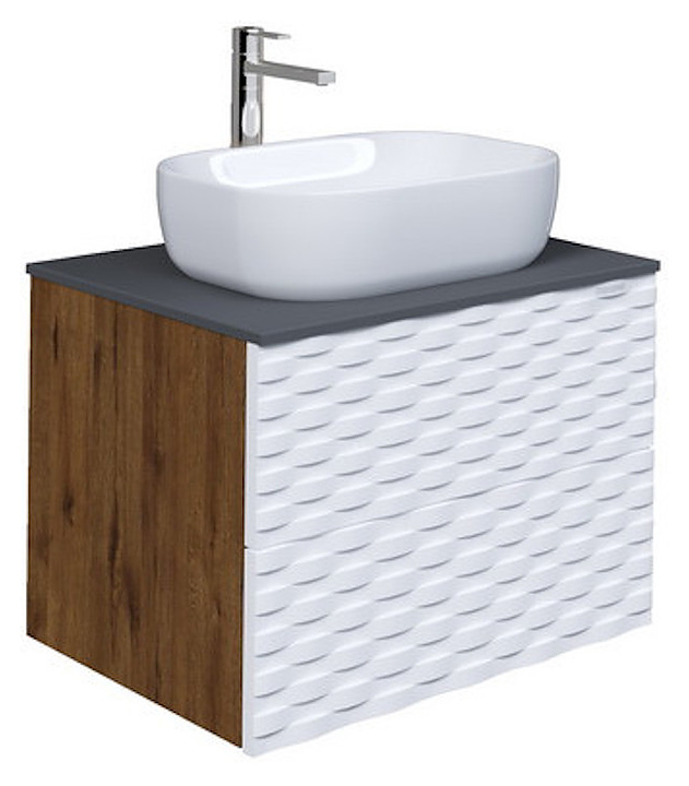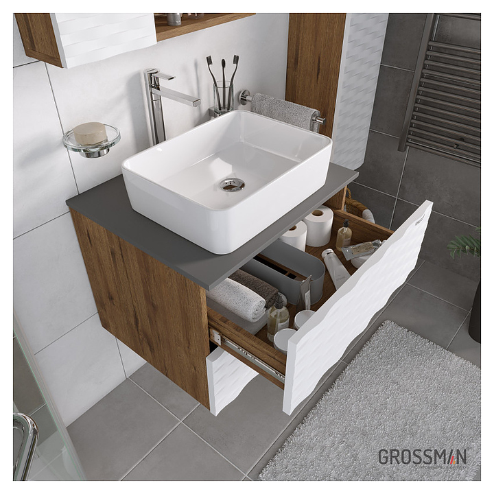 Тумба под раковину Grossman Альба 65 дополнит интерьер ванной комнаты. Благодаря подвесной конструкции модель не занимает много места, что экономит пространство в ванной комнате и облегчает уборку. Тумба оснащена 2 выдвижными ящиками с системой плавного закрывания и распашной дверцей. Корпус выполнен из влагостойкой ЛДСП, фасад - из МДФ. Изделие покрыто матовой пленкой для защиты от внешних воздействий. Может использоваться вместе с умывальником GR-3016. В комплект поставки входят крепления. Особенности: