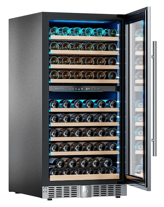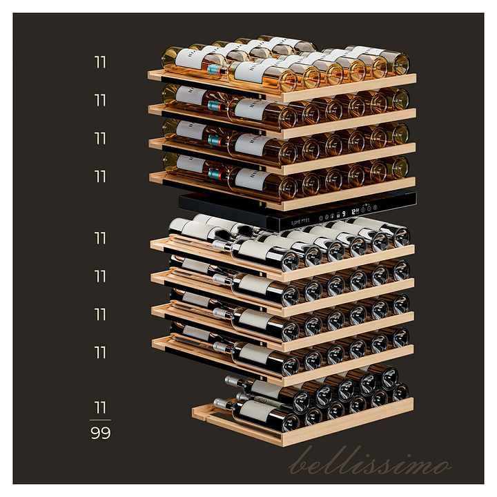 Винный шкаф MEYVEL MV99PRO-KST2 предназначен для демонстрации, хранения и создания оптимальных условий для сохранения всех вкусовых свойств вина в бутылках на предприятиях общественного питания, торговли, в барах, ресторанах, специализированных магазинах, частных домах или квартирах. Модель оснащена сенсорной панелью управления, электронным термостатом, понорамной светодиодной подсветкой, замком, угольным фильтром, 9 выкатными полками и регулируемыми по высоте ножками. Корпус выполнен из окрашенной в черный цвет стали, дверь - из тройного стеклопакета с УФ защитой, полки - из массива бука. Особенности: