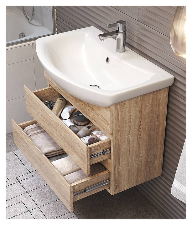 Тумба под раковину VIGO Wing tp.WIN.BAL.60.2Y выполнена в современном стиле и прекрасно дополнит интерьер любой ванной комнаты. Благодаря подвесной конструкции модель не занимает много места и облегчает уборку. Тумба оснащена интегрированными в фасад ручками и ящиками полного выдвижения с доводчиком. Изделие выполнено из ЛДСП и покрыто ламинатом. Тумба используется с раковиной Santek Балтика 1.WH11.0.246. В комплект поставки входит сифон. Раковина и смеситель в комплект поставки не входят. Дополнительные характеристики:
