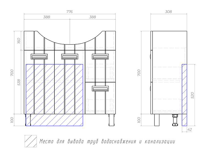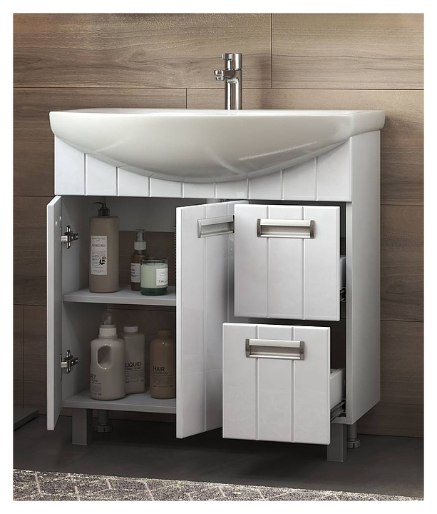 Тумба под раковину VIGO Diana tn.DIA.BAL.80.2D.2Y выполнена в современном стиле и прекрасно дополнит интерьер любой ванной комнаты. Напольная конструкция обеспечивает легкий монтаж и не требует специального ремонта в помещении. Модель оснащена 2 распашными дверцами с плавным закрыванием и 2 ящиками полного выдвижения. Корпус выполнен из ЛДСП и покрыт ламинатом, фасад - из ЛМДФ с пленкой, ручки - из металла. Тумба используется с раковиной Santek Балтика 1.WH50.1.524. Раковина и смеситель в комплект поставки не входят. Дополнительные характеристики: