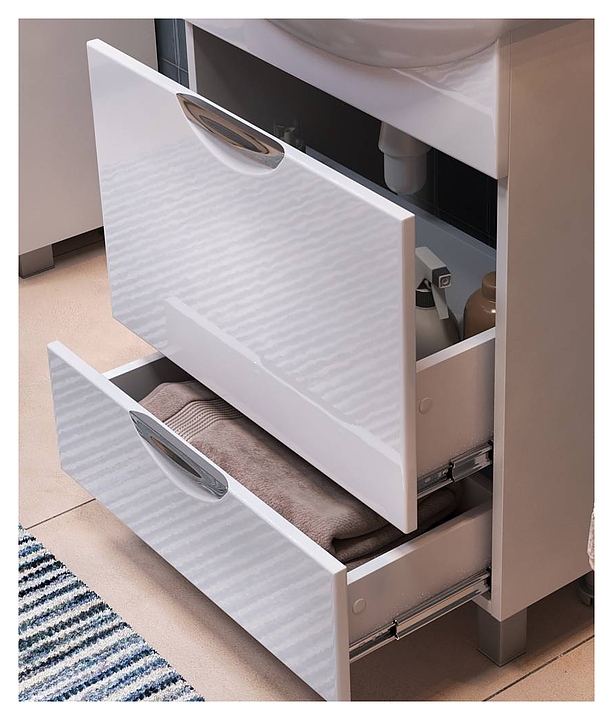 Тумба под раковину VIGO Callao tn.CAL.BAL.60.2Y выполнена в современном стиле и прекрасно дополнит интерьер любой ванной комнаты. Напольная конструкция обеспечивает легкий монтаж и не требует специального ремонта в помещении. Модель оснащена регулируемыми ножками, 2 врезными ручками и 2 ящиками полного выдвижения. Корпус выполнен из ЛДСП и покрыт ламинатом, фасад - из ЛМДФ с пленкой, ручки - из металла. Тумба используется с раковиной Santek Балтика 1.WH11.0.246. Раковина и смеситель в комплект поставки не входят. Дополнительные характеристики: