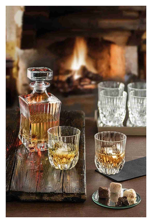 Графин RCR Cristalleria Italiana Style Adagio 51526020106 используется на предприятиях общественного питания, в гостиницах и домашних условиях для подачи виски и других напитков. Емкость квадратного сечения оснащена вогнутыми бортами, невысокой горловиной с выступающей кромкой и крышкой с широким восьмиугольным наконечником. Изделие выполнено из высококачественного хрустального стекла с декором внешней поверхности легкой огранкой стенок и глубокими вырезами в основании для создания эффектной игры света и цвета при наполнении и перемещении сосуда. Особенности: