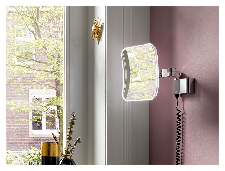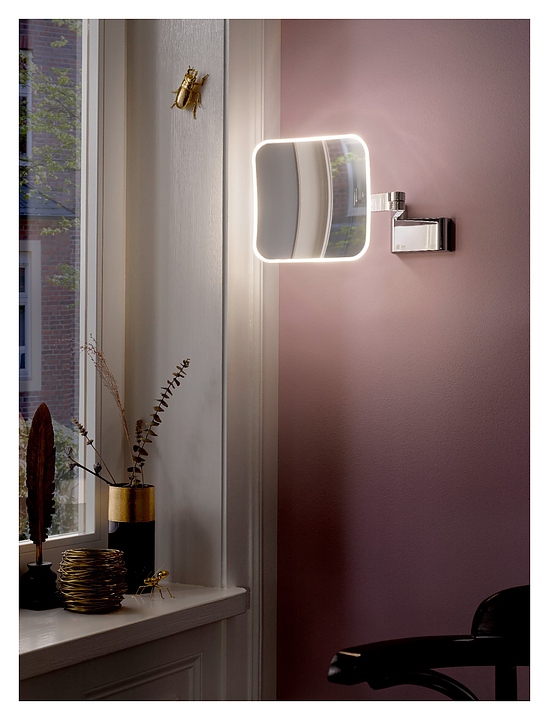 Косметическое зеркало EMCO Evo предназначено для макияжа, бритья и других манипуляций с лицом в ванной комнате. Модель оснащена 2 переключателями яркости и цвета свечения, LED-подсветкой, пятикратным увеличительным зеркалом и шнуром с вилкой. Изделие выполнено из металла и хрустального стекла. Особенности: