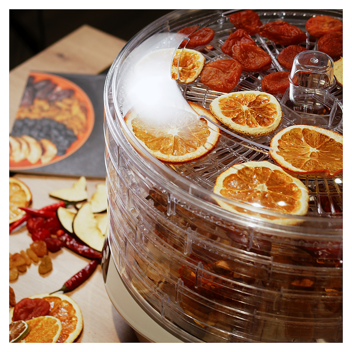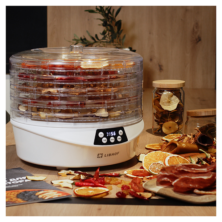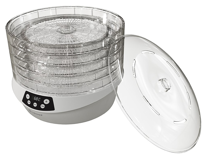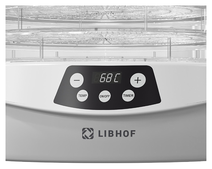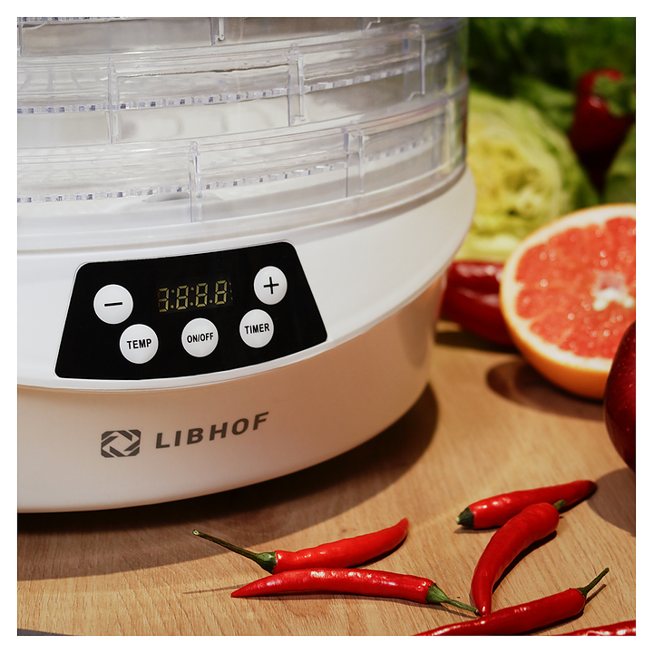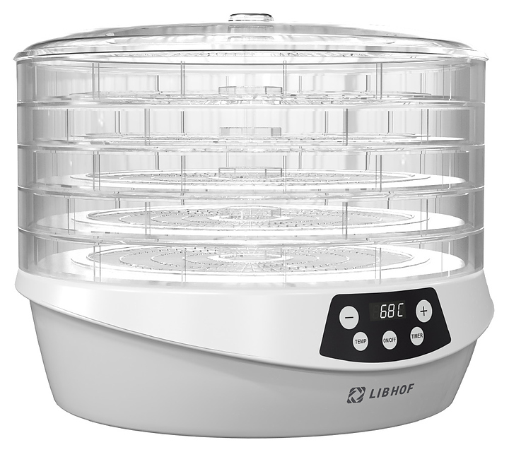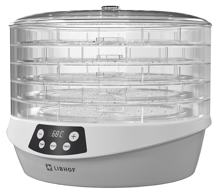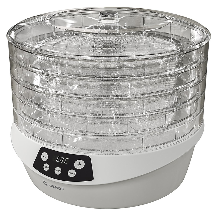 Дегидратор Libhof FDS-053 используется для сушки овощей, фруктов, ягод, грибов и трав, а также вяления рыбы, расстойки теста, приготовления сухариков, пастилы и йогурта в домашних условиях. Модель оснащена электронной панелью управления, таймером и дисплеем, на котором отображается текущая температура и время. Корпус устройства выполнен из жаропрочного пластика. В комплект поставки входят 5 съемных прозрачных пластиковых лотков и поддон для сбора капель. Особенности: