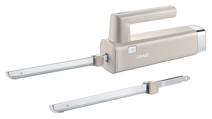 Электронож Graef EK 508 предназначен для быстрой нарезки различных продуктов, в том числе замороженных, на куски и ломтики в домашних условиях. Модель оснащена Г-образной рукояткой и кабелем питания с вилкой. Корпус выполнен из пластика бежевого оттенка с серебристой вставкой в основании, лезвия – из высококачественной нержавеющей стали. В комплект поставки входят 2 сменных лезвия. Особенности: