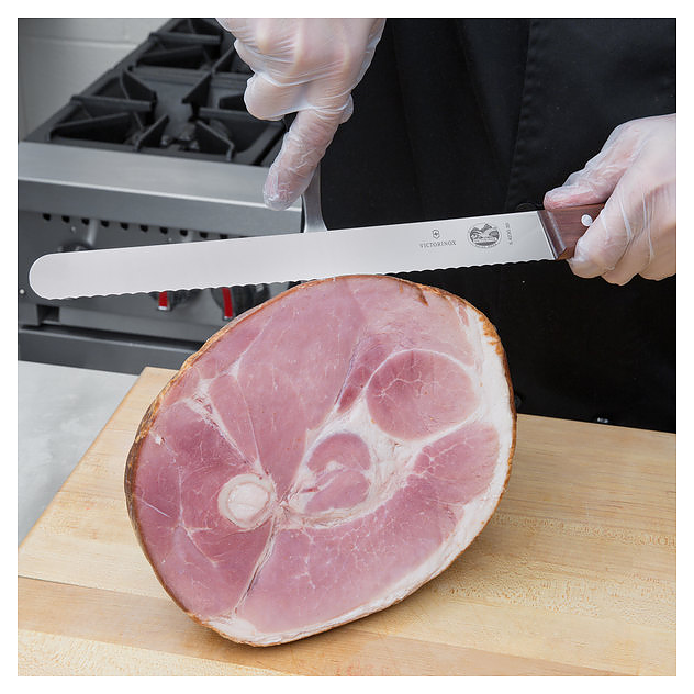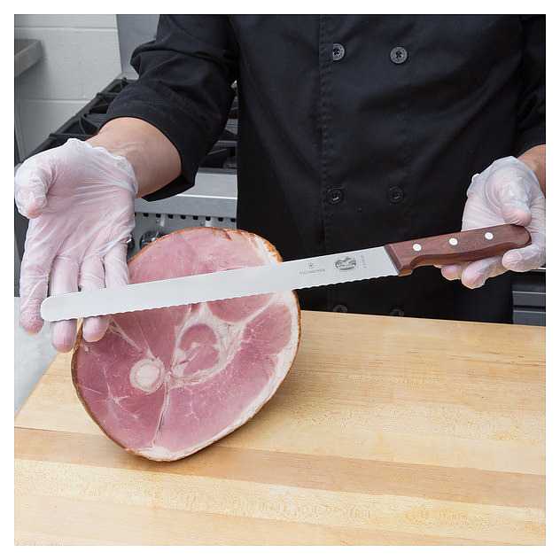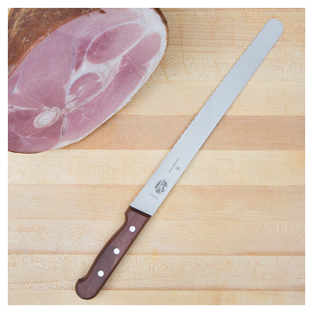 Нож Victorinox 5.4230.30 Rosewood используется для нарезания ломтиками запеченных мяса, птицы, мясных полуфабрикатов и аналогичных продуктов на предприятиях общественного питания и в домашних условиях. Модель оснащена лезвием с зубчатой режущей кромкой и округлым наконечником. Клинок выполнен из высококачественной мартенситной нержавеющей стали с полированной поверхностью, рукоятка – из прочной модифицированной древесины в коричневых тонах. Особенности:
