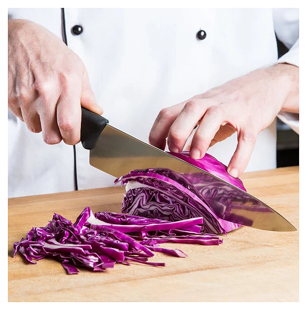 Поварской шеф-нож Victorinox 5.2003.22 Fibrox используется для нарезки и измельчения различных продуктов на предприятиях общественного питания и в домашних условиях. Модель оснащена лезвием с прямой режущей кромкой и острым клиновидным наконечником. Клинок выполнен из высококачественной мартенситной нержавеющей стали с полированной поверхностью, рукоятка – из комбинированного полимера фиброкс: твердая внутренняя часть – из полипропилена (PP), внешняя – из термопластичного эластомера (TPE) черного цвета. Особенности: