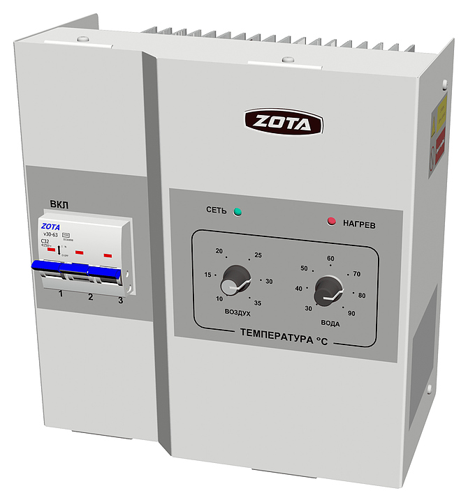 Электрический котел Zota Econom SSR 15 предназначен для автономного теплоснабжения жилых и производственных помещений в системах с естественной циркуляцией. Котел состоит из вертикально ориентированных бака и защитного кожуха, бак сварной конструкции оснащен блоком трубчатых электронагревателей (ТЭНами) сверху, 2 патрубками для теплоносителя: входным снизу и выходным сверху, монтажными скобами на задней панели для настенной установки; корпус пульта управления состоит из основания и крышки, на основании установлены вводной автомат, коммутатор нагрузки и монтажные колодки, на крышке – плата и панель управления. Защитные кожухи выполнены из листовой стали с внешним антикоррозийным покрытием полимерной краской белого цвета, ТЭНы – из аустенитной нержавеющей стали с нихромовой спиралью, упаковка – из гофрокартона. Комплектация: