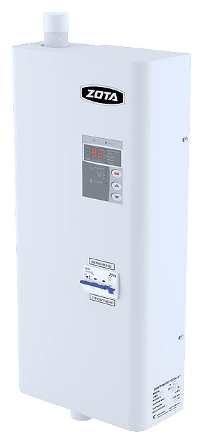Электрический котел Zota LUX 70 предназначен для обогрева жилых и производственных помещений, а также нагрева воды для технических целей. Модель оснащена вертикально ориентированными баком и защитным кожухом, расположенным на фронтальной панели блоком управления с вводным автоматом, кнопочной клавиатурой, светодиодными индикаторами и светодиодным цифровым дисплеем, бак сварной конструкции имеет несколько блоков трубчатых электронагревателей (ТЭНов) сверху, 2 патрубка для теплоносителя: входной снизу и выходной сверху. Защитный кожух выполнен из листовой стали с внешним антикоррозийным покрытием порошковой краской белого цвета, ТЭНы – из аустенитной нержавеющей стали с нихромовой спиралью, упаковка – из гофрокартона.