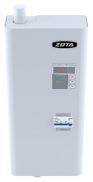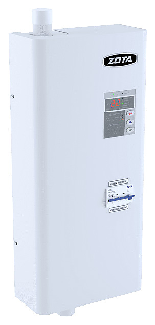 Электрический котел Zota LUX 9 предназначен для обогрева жилых и производственных помещений, а также нагрева воды для технических целей. Модель оснащена вертикально ориентированными баком и защитным кожухом, расположенным на фронтальной панели блоком управления с вводным автоматом, кнопочной клавиатурой, светодиодными индикаторами и светодиодным цифровым дисплеем, бак сварной конструкции имеет блок трубчатых электронагревателей (ТЭНов) сверху, 2 патрубка для теплоносителя: входной снизу и выходной сверху. Защитный кожух выполнен из листовой стали с внешним антикоррозийным покрытием порошковой краской белого цвета, ТЭНы – из аустенитной нержавеющей стали с нихромовой спиралью, упаковка – из гофрокартона.