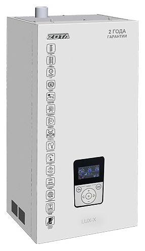 Электрический котел Zota LUX-X 15 предназначен для обогрева жилых и производственных помещений, а также нагрева воды для технических целей. Модель оснащена вертикально ориентированными баком и защитным кожухом, расположенным на фронтальной панели многофункциональным электронным контроллером X-Line 100E с мембранной клавиатурой и информативным графическим дисплеем с цифровыми и символьными сегментами индикации, бак сварной конструкции имеет 2 блока трубчатых электронагревателей (ТЭНов) сверху, 2 патрубка для теплоносителя: входной снизу и выходной сверху. Защитный кожух выполнен из листовой стали с внешним антикоррозийным покрытием порошковой краской белого цвета, ТЭНы – из аустенитной нержавеющей стали с нихромовой спиралью, упаковка – из гофрокартона.