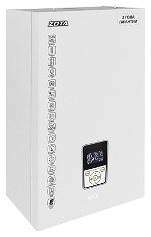 Электрический котел Zota MK-X 24 предназначен для обогрева жилых и производственных помещений, а также нагрева воды для технических целей. Модель оснащена вертикально ориентированными баком, мембранным расширительным баком, защитным кожухом, 3-х скоростным циркуляционным насосом Zota Ring 25/60, манометром, расположенным на фронтальной панели многофункциональным электронным контроллером X-Line 100E с мембранной клавиатурой и информативным графическим дисплеем с цифровыми и символьными сегментами индикации, бак сварной конструкции имеет 2 блока трубчатых электронагревателей (ТЭНов) сверху, входной и выходной патрубки для теплоносителя снизу. Защитный кожух выполнен из листовой стали с внешним антикоррозийным покрытием порошковой краской белого цвета, ТЭНы – из аустенитной нержавеющей стали с нихромовой спиралью, упаковка – из гофрокартона.