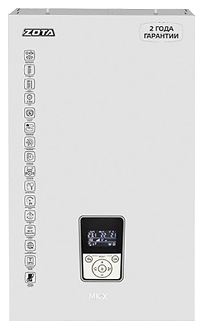 Электрический котел Zota MK-X 36 предназначен для обогрева жилых и производственных помещений, а также нагрева воды для технических целей. Модель оснащена вертикально ориентированными баком, защитным кожухом, 3-х скоростным циркуляционным насосом Zota Ring 25/70, манометром, расположенным на фронтальной панели многофункциональным электронным контроллером X-Line 100E с мембранной клавиатурой и информативным графическим дисплеем с цифровыми и символьными сегментами индикации, бак сварной конструкции имеет 3 блока трубчатых электронагревателей (ТЭНов) сверху, входной и выходной патрубки для теплоносителя снизу. Защитный кожух выполнен из листовой стали с внешним антикоррозийным покрытием порошковой краской белого цвета, ТЭНы – из аустенитной нержавеющей стали с нихромовой спиралью, упаковка – из гофрокартона.