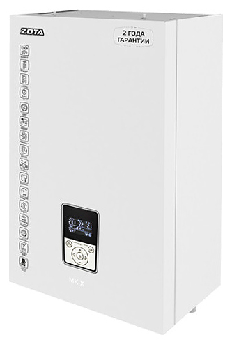 Электрический котел Zota MK-X 6 предназначен для обогрева жилых и производственных помещений, а также нагрева воды для технических целей. Модель оснащена вертикально ориентированными баком, мембранным расширительным баком, защитным кожухом, 3-х скоростным циркуляционным насосом Zota Ring 25/40, манометром, расположенным на фронтальной панели многофункциональным электронным контроллером X-Line 100E с мембранной клавиатурой и информативным графическим дисплеем с цифровыми и символьными сегментами индикации, бак сварной конструкции имеет блок трубчатых электронагревателей (ТЭНов) сверху, входной и выходной патрубки для теплоносителя снизу. Защитный кожух выполнен из листовой стали с внешним антикоррозийным покрытием порошковой краской белого цвета, ТЭНы – из аустенитной нержавеющей стали с нихромовой спиралью, упаковка – из гофрокартона.