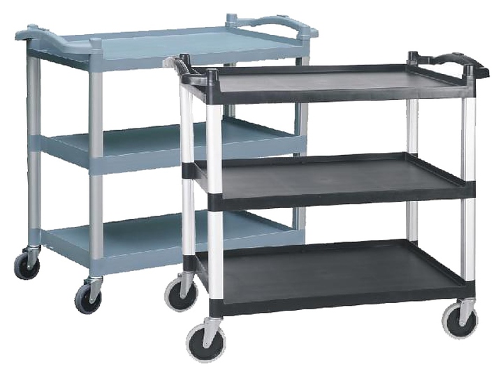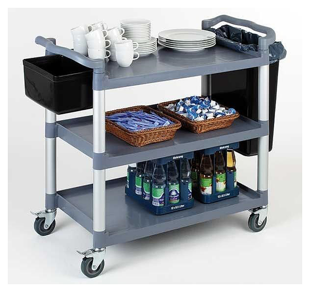 Тележка для обслуживания NORMA F4771 предназначена для транспортировки посуды, инвентаря, продуктов, пищевых отходов и предметов сервировки на предприятиях общественного питания, в медицинских учреждениях, санаториях и отелях. Модель оснащена удобными ручками, 3 полками с бортиками и 4 стальными колесами с особым покрытием, обеспечивающим бесшумную перевозку и устойчивость тележки при маневрировании. Стойки модели изготовлены из алюминия, полки - из прочного полипропилена. Характеристики: