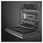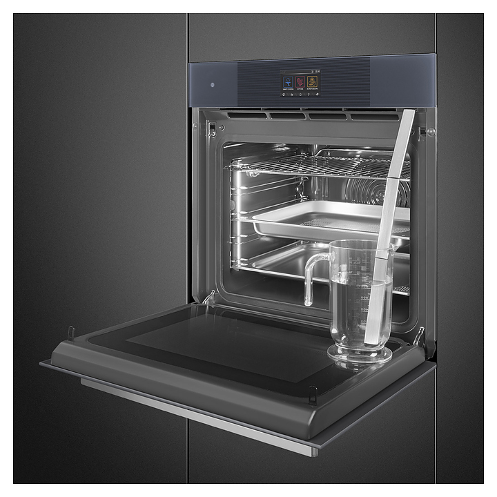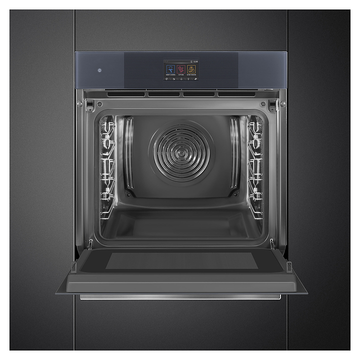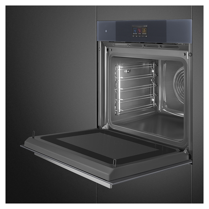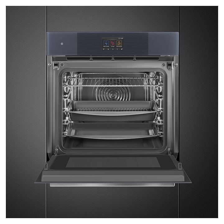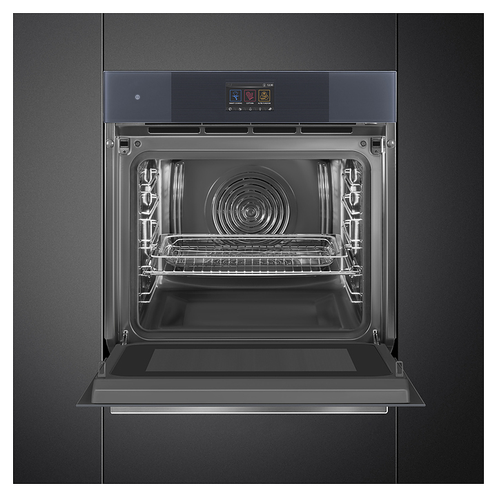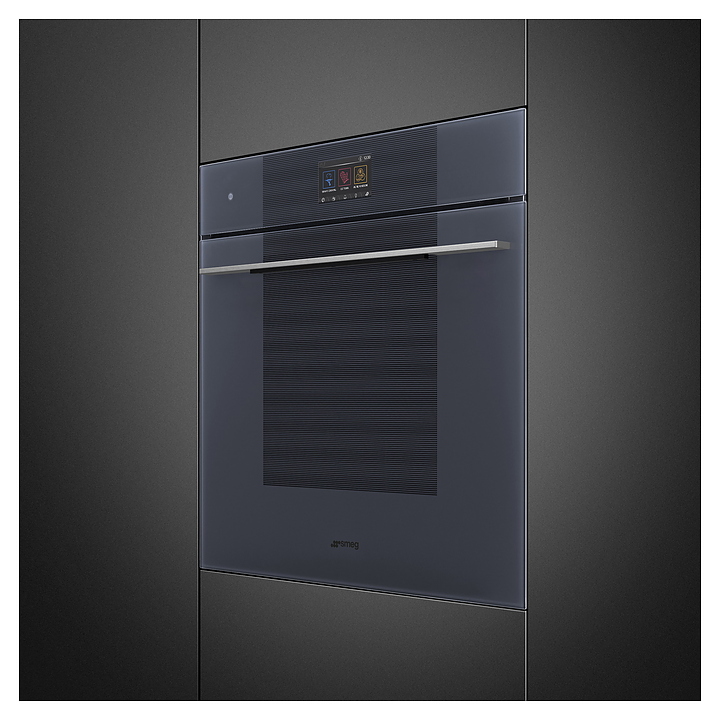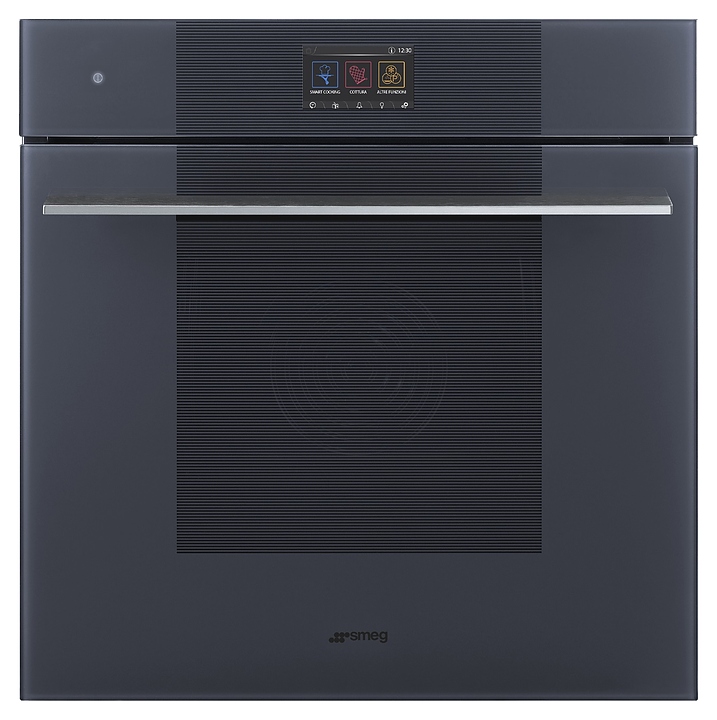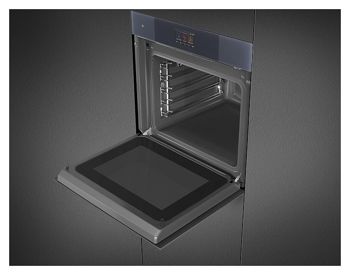 Электрический духовой шкаф SMEG SO6104APG предназначен для приготовления большого ассортимента блюд в домашних условиях. Модель оснащена просторной рабочей камерой Galileo с верхним и нижним нагревательными элементами, грилем, расположенными в задней стенке кольцевым нагревателем и вентилятором, магнетроном, парогенератором, 2 съемными стойками с 5 уровнями направляющих для противней, откидной дверью со смотровым окном и длинной уплощенной горизонтальной рукояткой, сенсорным управлением с цветным TFT-дисплеем (VIVO Screen). Корпус выполнен из высококачественной стали, фронт c матовым покрытием серого оттенка Neptune Grey и полным остеклением прозрачным стеклом без винтового крепежа, рукоятка – из металла с сатинированной серебристой поверхностью, сплошной глубокий противень – из эмалированной стали, стойки с направляющими, стандартный и перфорированный противни – из нержавеющей стали.