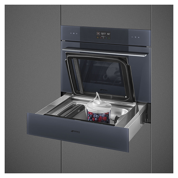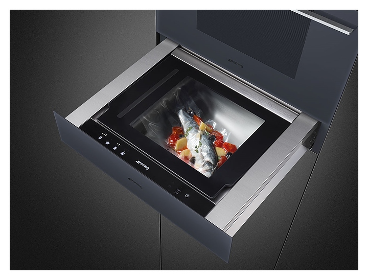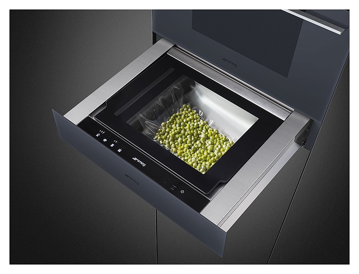 Встраиваемый вакуумный упаковщик SMEG CPV115G используется в домашних условиях для упаковки готовых блюд и пищевых продуктов в герметичную тару для сохранения свежести, предотвращения размножения микроорганизмов и смешивания запахов. Модель оснащена камерой с продольной запаивающей планкой, кабелем питания с вилкой (Shuko) и внутренней сенсорной панелью управления. Корпус выполнен из нержавеющей стали марки 304, крышка – из закаленного стекла с рамкой, фронтальная панель с покрытием серого оттенка Neptune Grey и внешним остеклением прозрачным стеклом. В комплект поставки входят адаптер для вакуумирования во внешних контейнерах, 25 пакетов LifeBags для хранения и 25 пакетов V-Cook для приготовления в режиме су-вид. Особенности: