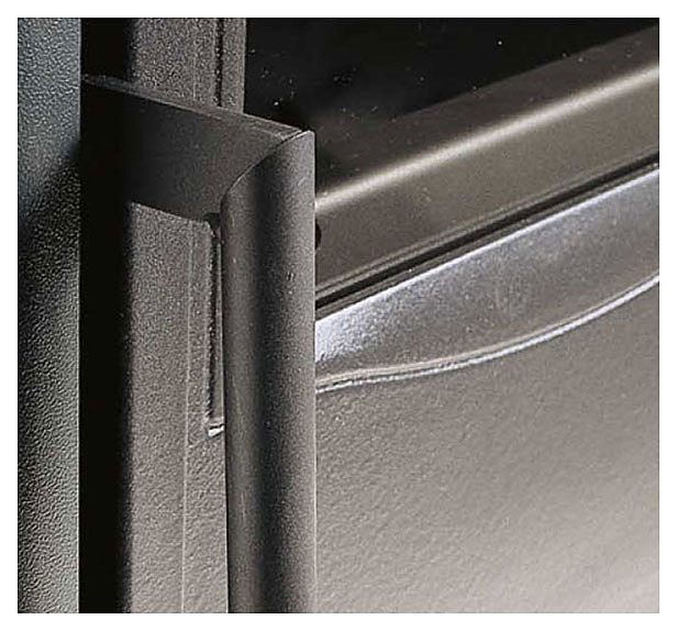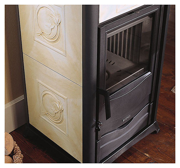 Духовка, дверка и верхняя плита выполнены из эмалированного чугуна. Оборудование облицовано майоликой.