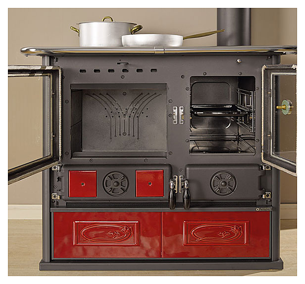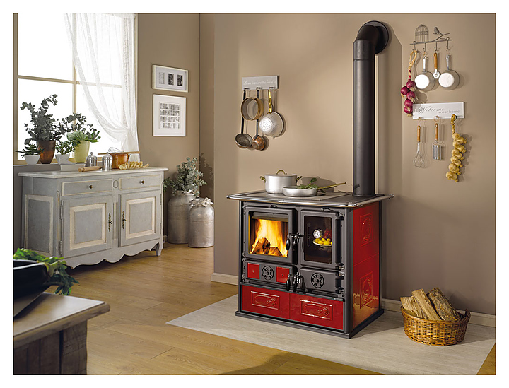 Отопительно-варочная печь La Nordica Rosa Reverse серии Cucine a Legna предназначена для создания тепла в помещении при помощи горящих дров в квартирах, частных домах и отелях. Модель оснащена системой третичного дожига, позволяющей сократить выбросы, системой чистого стекла, предотвращающей образование отложений, и духовкой. Верхняя плита и кольца выполнены из полированного чугуна, верхняя рамка - из остеклованного чугуна, духовка - из эмали. Оборудование облицовано майоликой. Дополнительные характеристики: