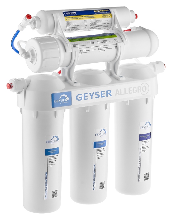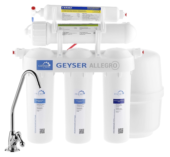 Обратноосмотическая система ГЕЙЗЕР Аллегро предназначена для доочистки водопроводной воды. Фильтр снижает общее солесодержание (минерализацию), в том числе соли жесткости, до питьевых норм. Удаляет из воды тяжелые металлы (свинец, кадмий, медь, железо, хром и др.) и радиоактивные элементы (кобальт, полоний, цезий, радий). Очищает нитраты, нитриты, сульфаты и органические соединения. Полностью задерживает патогенные бактерии и болезнетворные вирусы. Устраняет привкусы, запахи и цветность воды. Комплектация: