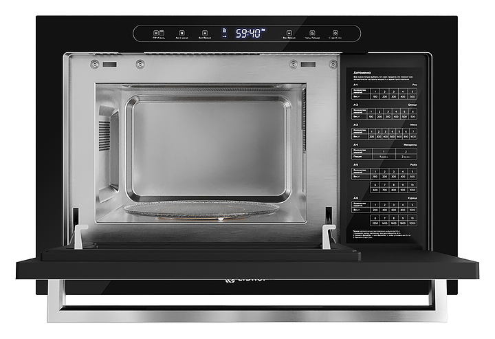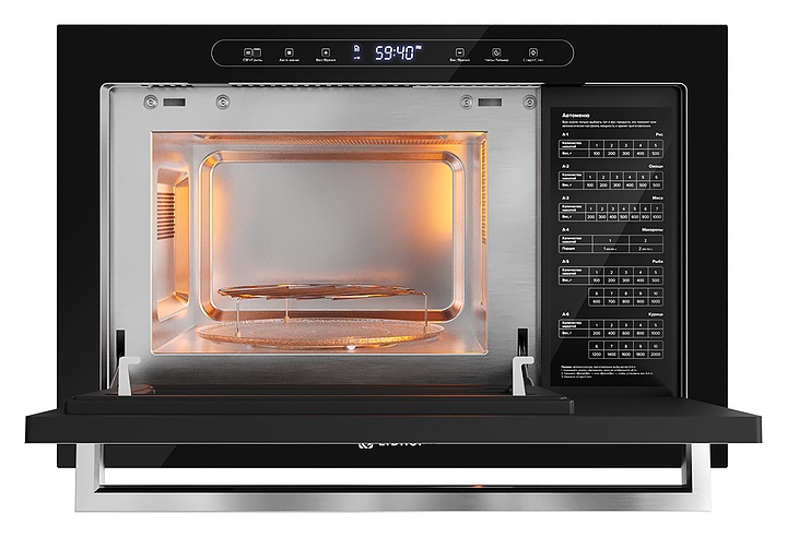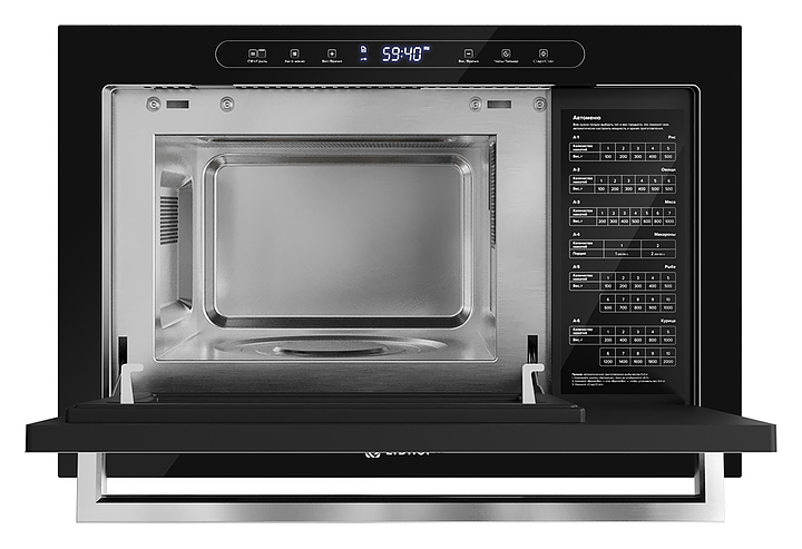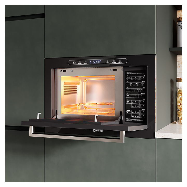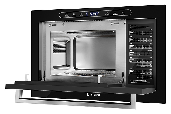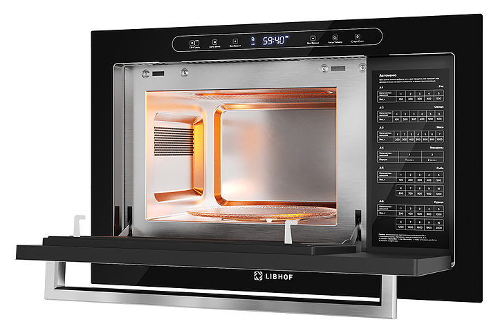 Микроволновая печь Libhof MWB-5725B предназначена для приготовления пищи, подогрева готовых блюд и ингредиентов, а также размораживания полуфабрикатов в частных домах, квартирах, отелях и офисах. Модель оснащена сенсорной панелью управления, кварцевым грилем, откидной дверцей и внутренней подсветкой. Фасад выполнен из черного стекла, внутренняя камера - из нержавеющей стали. В комплект поставки входят вертел, вращающаяся тарелка из боросиликатного стекла и металлическая подставка для гриля. Особенности: