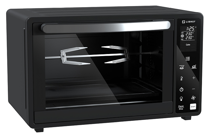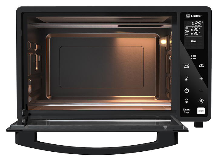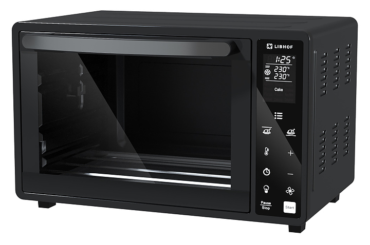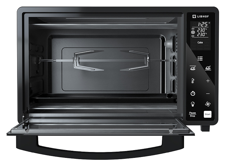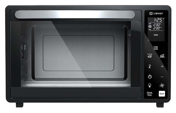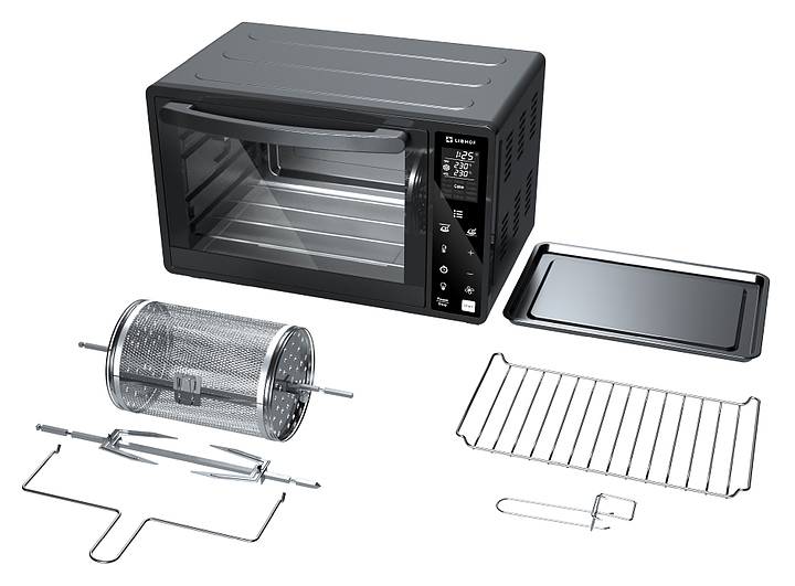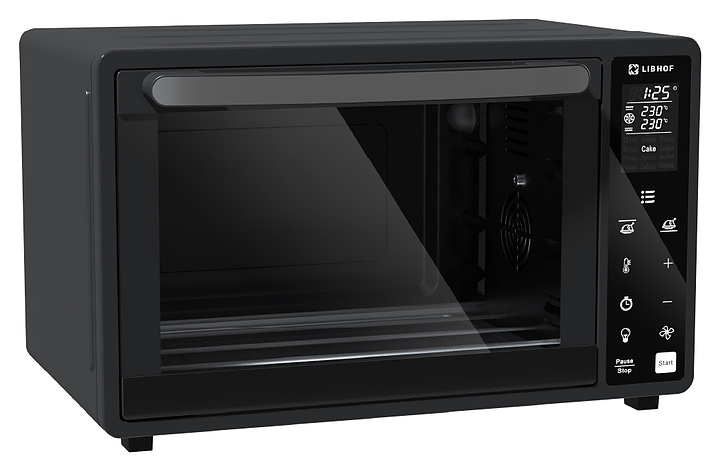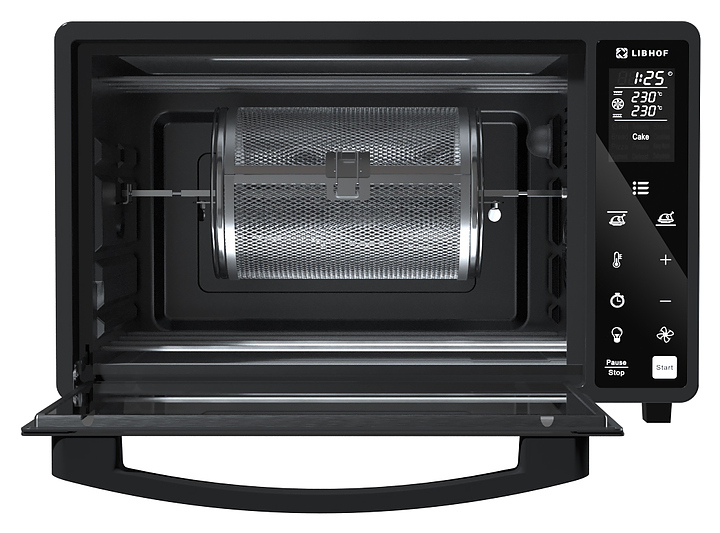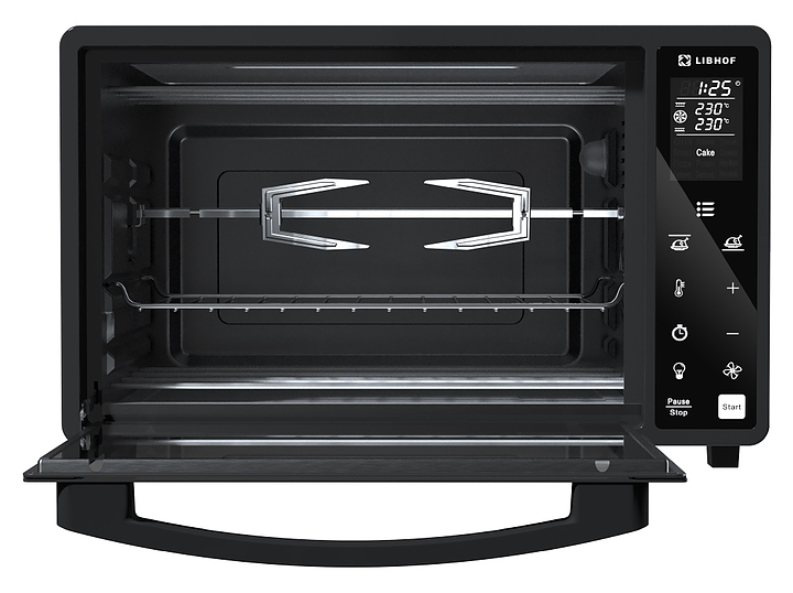 Мини-печь Libhof OVX-36 предназначена приготовления и разогрева различных блюд, выпечки кондитерских и хлебобулочных изделий в частных домах, квартирах, отелях и офисах. Модель оснащена сенсорной панелью управления с дисплеем и внутренней подсветкой. Дверца выполнена из двухслойного жаропрочного стекла, камера - с двойным антипригарным покрытием. В комплект поставки входят электромеханический вертел, решетка, поддон для сбора крошек, противень, держатель для противня/решетки и вращающаяся корзина для картофеля-фри. Особенности: