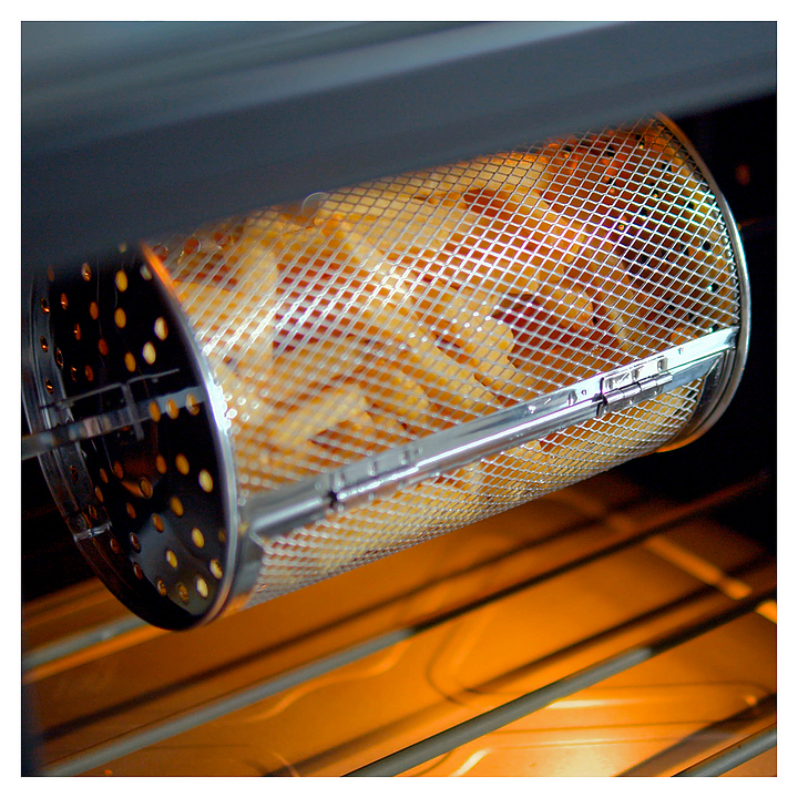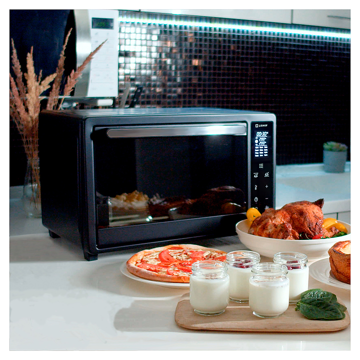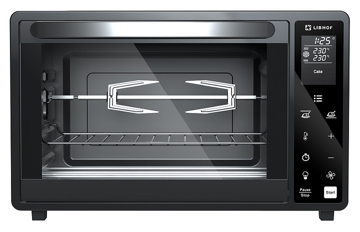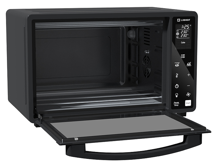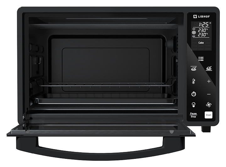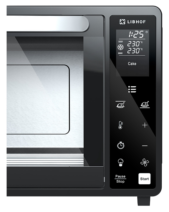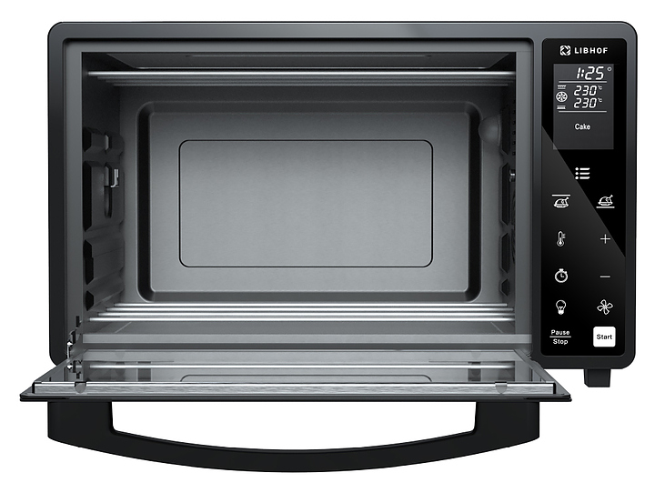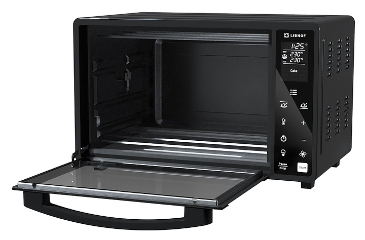 Мини-печь Libhof OVX-36 предназначена приготовления и разогрева различных блюд, выпечки кондитерских и хлебобулочных изделий в частных домах, квартирах, отелях и офисах. Модель оснащена сенсорной панелью управления с дисплеем и внутренней подсветкой. Дверца выполнена из двухслойного жаропрочного стекла, камера - с двойным антипригарным покрытием. В комплект поставки входят электромеханический вертел, решетка, поддон для сбора крошек, противень, держатель для противня/решетки и вращающаяся корзина для картофеля-фри. Особенности:
