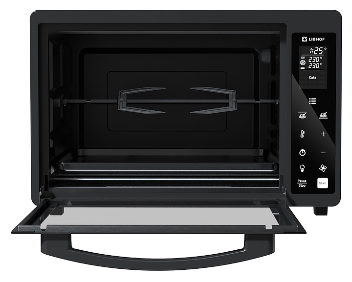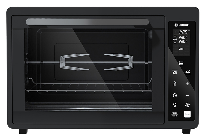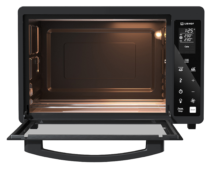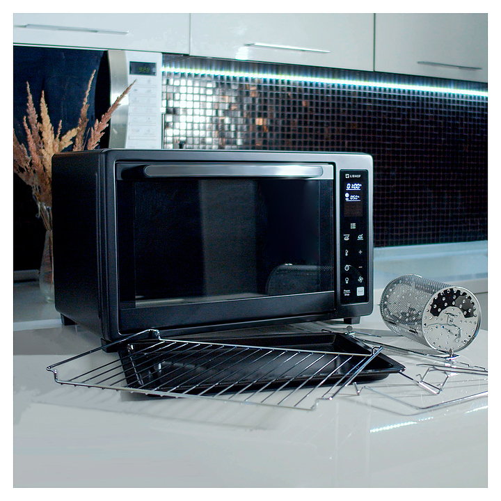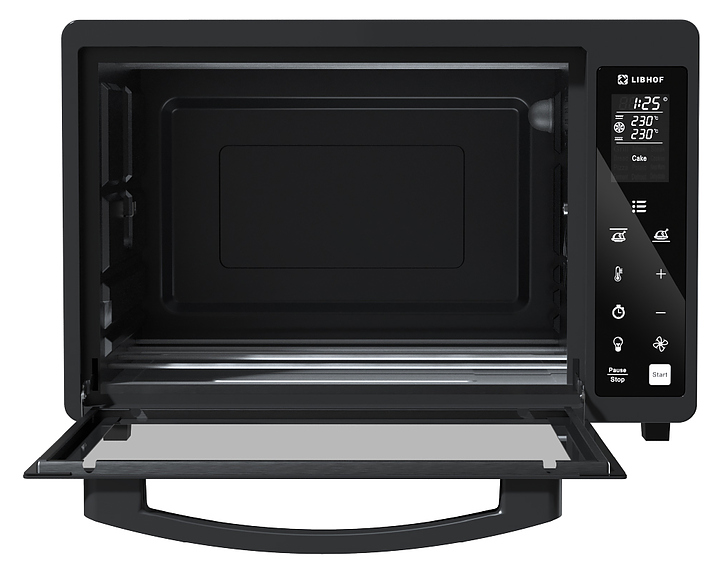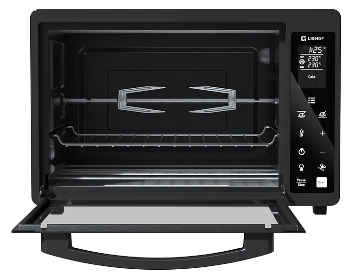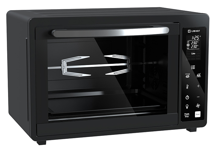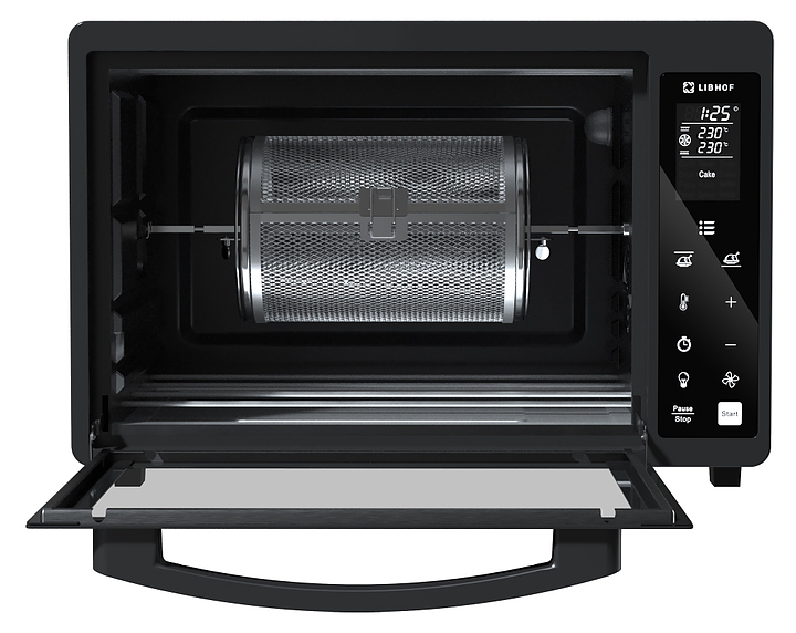Мини-печь Libhof OVX-46 предназначена приготовления и разогрева различных блюд, выпечки кондитерских и хлебобулочных изделий в частных домах, квартирах, отелях и офисах. Модель оснащена сенсорной панелью управления с дисплеем и внутренней подсветкой. Дверца выполнена из двухслойного жаропрочного стекла, камера - с двойным антипригарным покрытием. В комплект поставки входят электромеханический вертел, решетка, поддон для сбора крошек, противень, держатель для противня/решетки и вращающаяся корзина для картофеля-фри. Особенности: