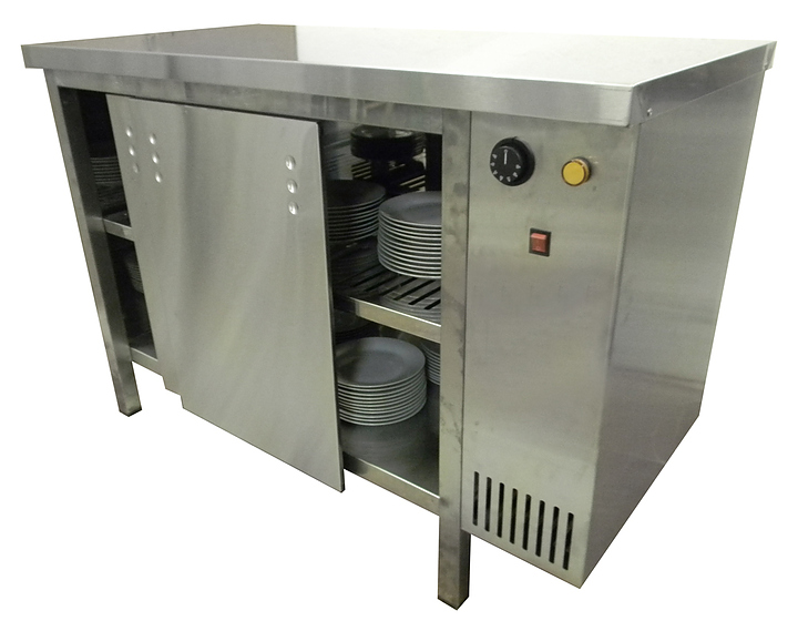 Тепловой стол ЦМИ СТТпДК-180/70 используется для подогрева тарелок перед сервировкой, а также для сохранения блюд и напитков в горячем виде на предприятиях общественного питания и торговли. Модель оснащена терморегулятором в правой фронтальной части изделия, кнопками включения и выключения, лампой индикации, 2 дверьми-купе, 4 устойчивыми ножками и вентилятором. Изделие полностью выполнено из нержавеющей стали. Особенности: