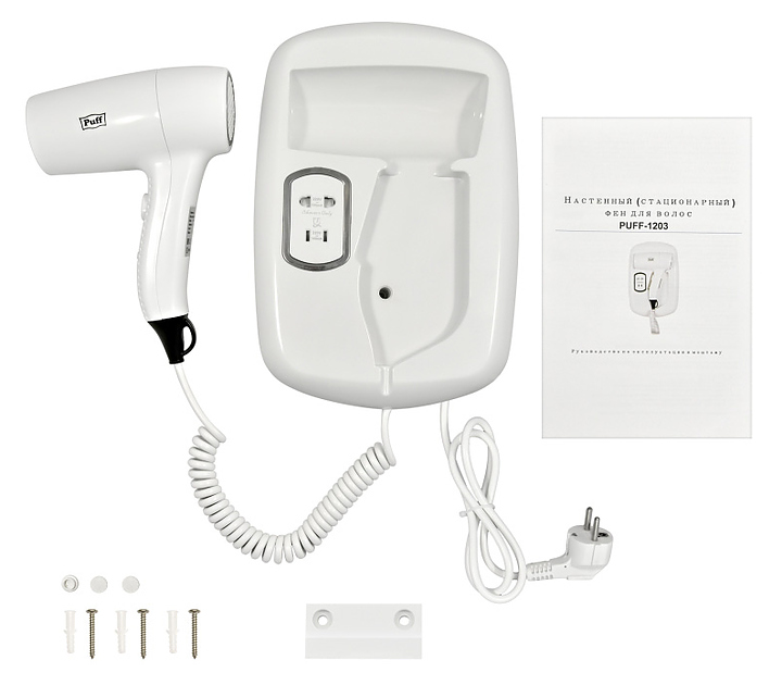 Настенный фен Puff 1203B предназначен для быстрой сушки и комфортной укладки в спорткомплексах, фитнес-центрах, бассейнах, отелях, гостиницах, частных домах и квартирах. Модель оснащена кнопкой включения и выключения, дополнительной розеткой на корпусе, 2 режимами сушки по температуре и опцией холодного воздуха. Корпус выполнен из ударопрочного ABS-пластика. В комплект поставки входят крепления. Особенности: